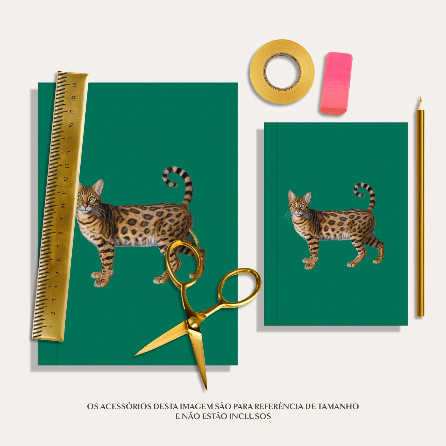 Caderninho de brochura em capa mole, com ilustração de gato bengal, no tamanho A6 ou A5. Interior com 90 páginas em branco feitas em Papel Polen.