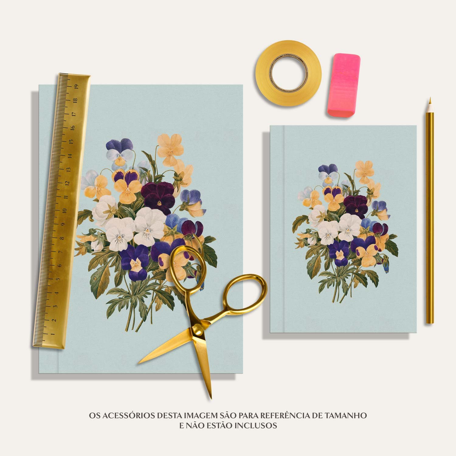 Caderninho de brochura em capa mole, com ilustração de amor perfeito, no tamanho A6 ou A5. Interior com 90 páginas em branco feitas em Papel Polen.