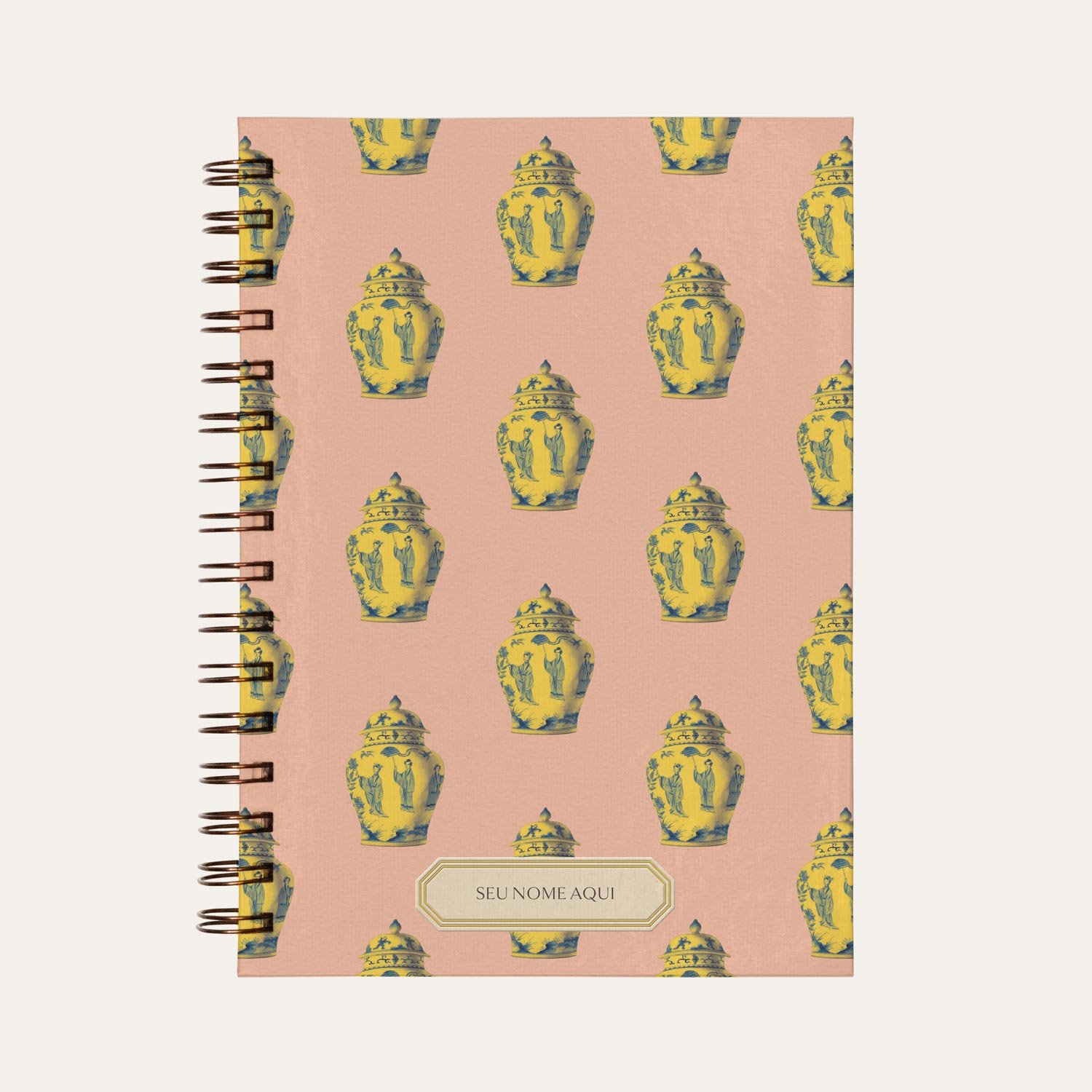 Caderno personalizado com estampa de potiches em collab com Carlos Reichmann, tamanho A5, espiral metálico bronze. Interior com 160 páginas de Papel Polen, disponível em branco, pautado ou pontilhado.