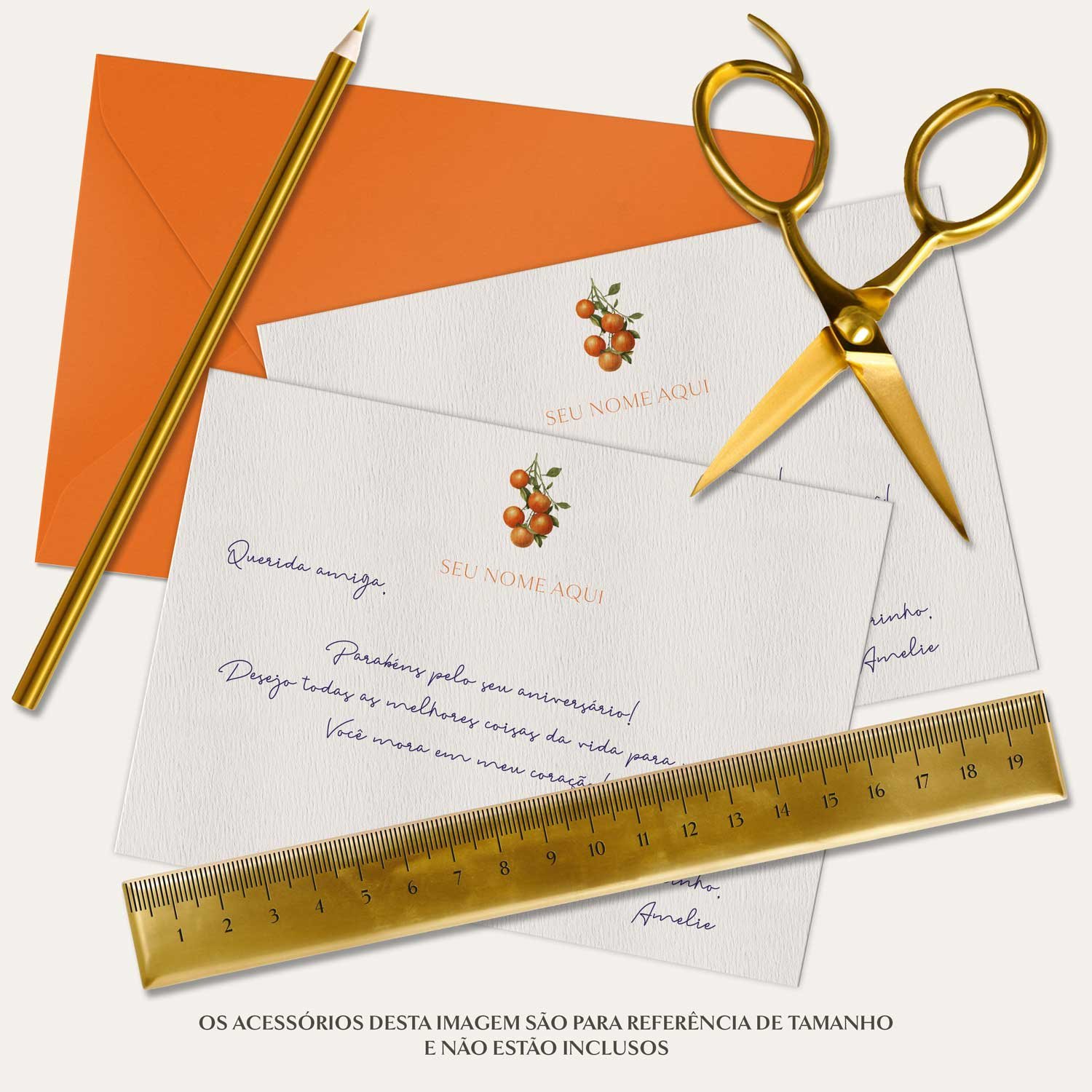 Descubra a elegância e a qualidade do nosso cartão personalizado, feito com papel italiano, suave ao toque e ideal para escrever. Este conjunto contém 8 cartões sociais decorados com tangerinas e 8 envelopes coloridos à sua escolha, proporcionando uma experiência de papelaria personalizada única.