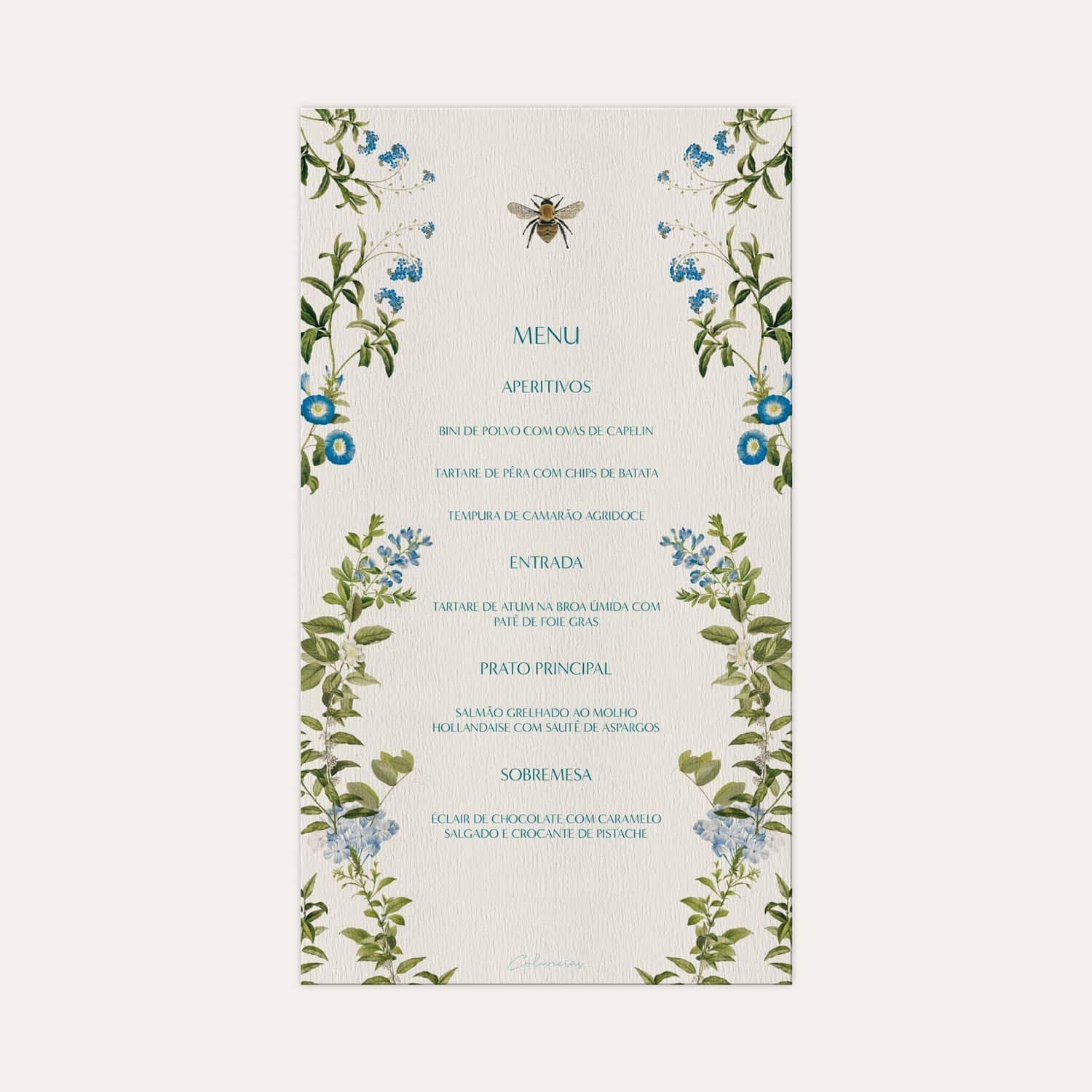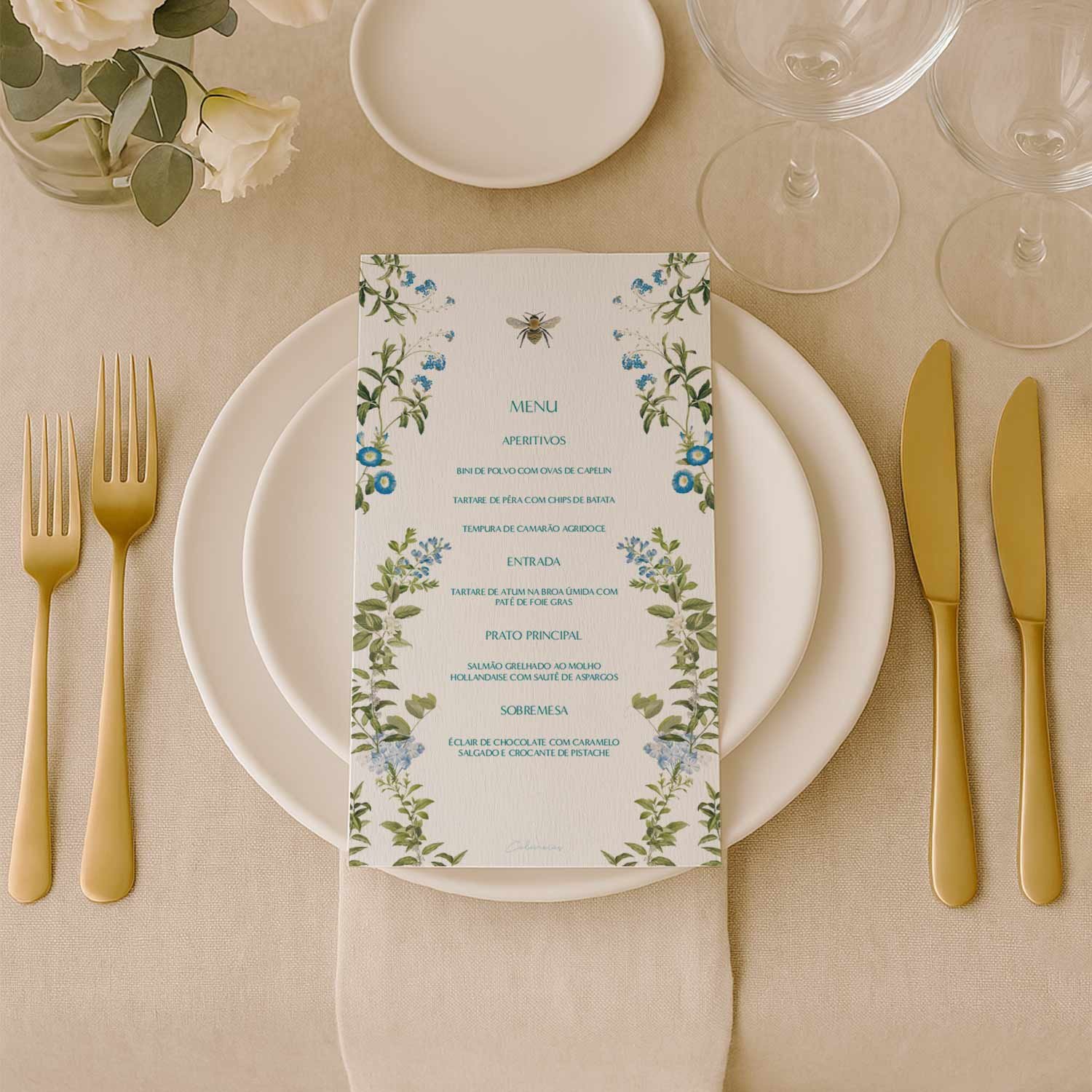 O que seria de uma mesa inesquecível sem um toque de papelaria especial? Nosso menu personalizado com flores azuis é aquele detalhe que transforma qualquer refeição em um momento memorável. Feito com papel italiano de alta gramatura, macio ao toque e com acabamento impecável, cada menu pode se encaixar perfeitamente com o seu evento, com o cardápio impresso de forma personalizada e decorado com ilustrações florais em uma composição autoral da Colmeias. Um gesto de carinho para seus convidados e um charme a mais na sua composição de mesa. Ideal para jantares, brunches, mini weddings, festas íntimas e eventos que pedem atenção aos detalhes.
